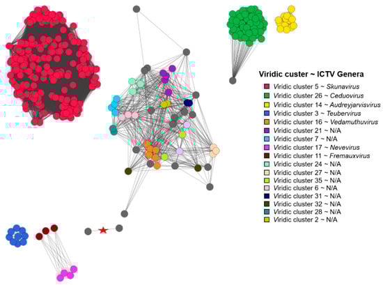 - Bin Jang, H.; Bolduc, B.; Zablocki, O.; Kuhn, J.H.; Roux, S.; Adriaenssens, E.M.; Brister, J.R.; Kropinski, A.M.; Krupovic, M.; Lavigne, R.; et al. Taxonomic assignment of uncultivated prokaryotic virus genomes is enabled by gene-sharing networks. Nat. Biotechnol. 2019, 37, 632–639. [Google Scholar] [CrossRef]