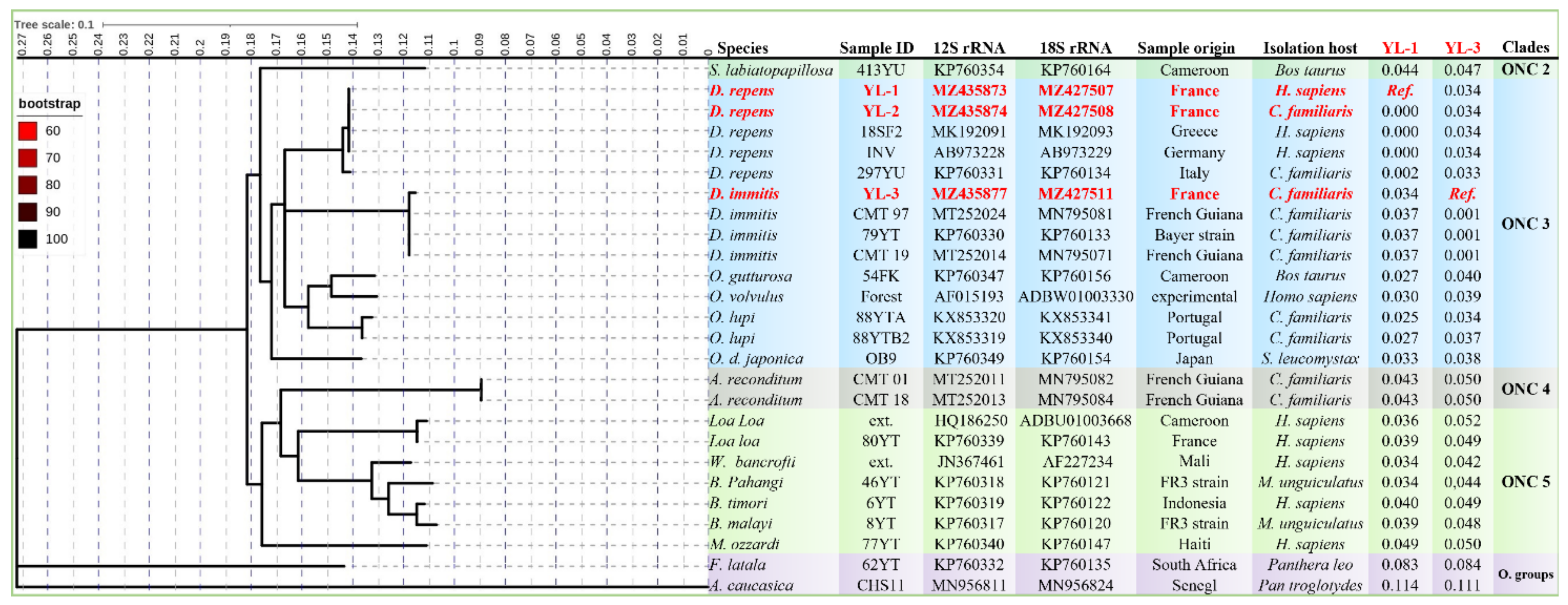 - Yilmaz, E.; Wongkamchai, S.; Ramünke, S.; Koutsovoulos, G.D.; Blaxter, M.L.; Poppert, S.; Schaper, R.; von Samson-Himmelstjerna, G.; Krücken, J. High genetic diversity in the Dirofilaria repens species complex revealed by mitochondrial genomes of feline microfilaria samples from Narathiwat, Thailand. Transbound. Emerg. Dis. 2019, 66, 389–399. [Google Scholar] [CrossRef] [Green Version]