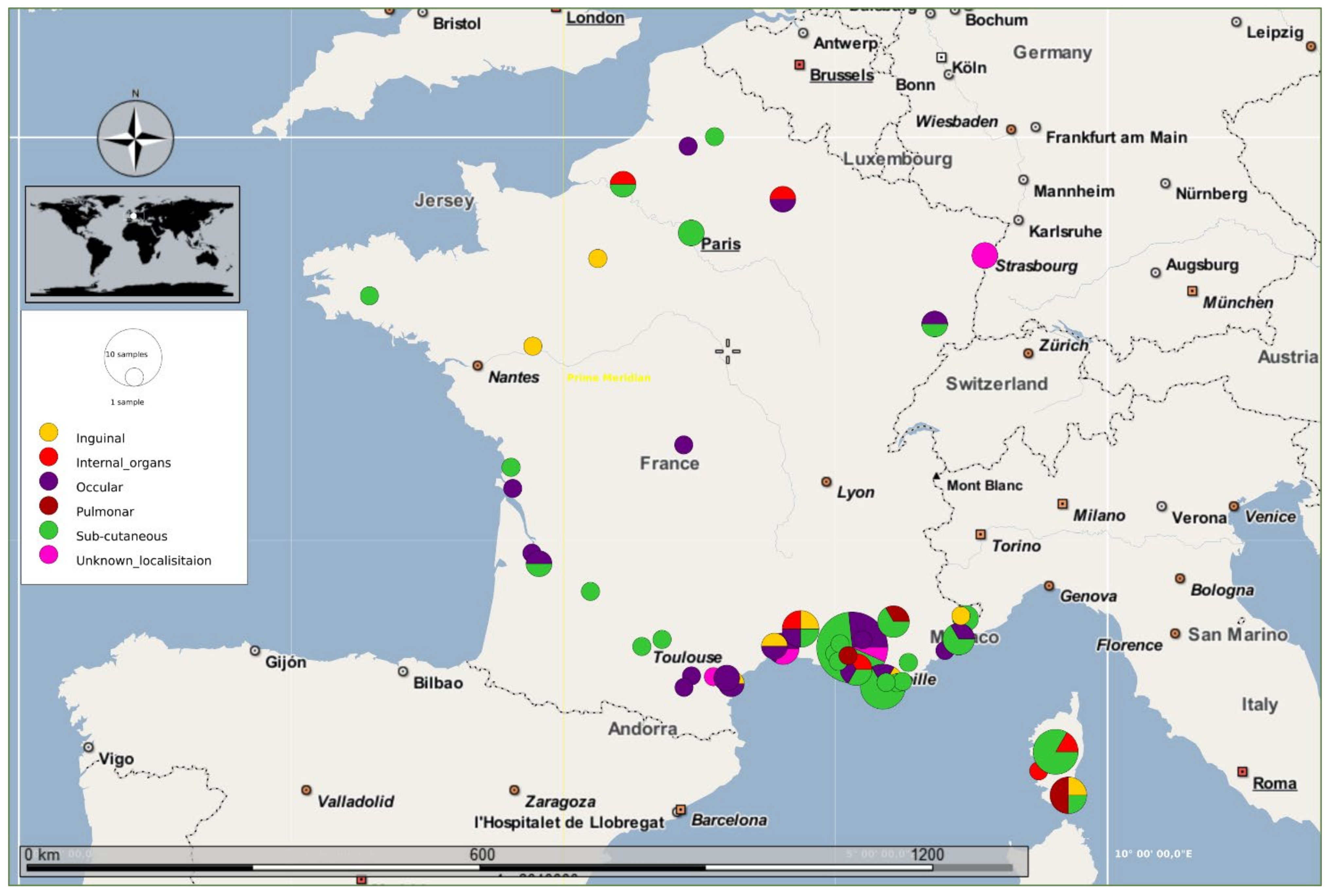 Laidoudi, Y.; Otranto, D.; Stolowy, N.; Amrane, S.; Santhakumari Manoj, R.R.; Polette, L.; Watier-Grillot, S.; Mediannikov, O.; Davoust, B.; L'Ollivier, C. Human and Animal Dirofilariasis in Southeast of France. Microorganisms 2021, 9, 1544. https://doi.org/10.3390/microorganisms9071544