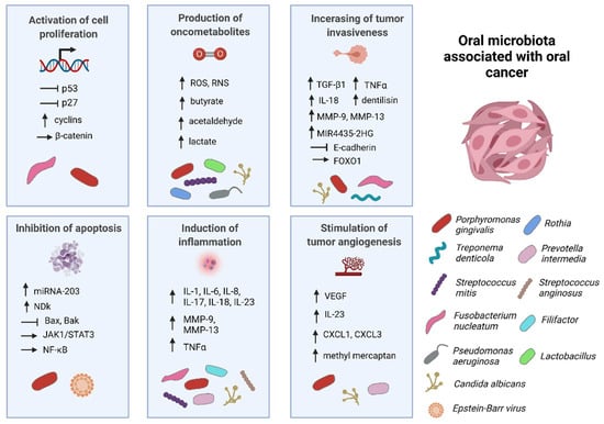 Chronic inflammation was shown to be closely related to carcinogenesis. Microbiota can participate in both of these processes, for example, through modulating the immune response of the host []. Substances such as reactive oxygen species, reactive nitrogen intermediates, or cytokines produced by immune cells can contribute toward the initiation of carcinogenesis through induction of mutations, genomic instability, or epigenetic changes. Proinflammatory cytokines subsequently activate key transcription factors such as STAT3 (signal transducer and activator of transcription) or NF-κB (nuclear factor kappa B) in premalignant lesions, and these mechanisms promote other malignant processes, such as cell proliferation, angiogenesis, or metastasis, and maintain the inflammatory tumor microenvironment. In addition to inducing chronic inflammation, the oral microbiota has also been linked to OSCC through the production of oncometabolites, induction of epithelial–mesenchymal transition (EMT), inhibition of apoptosis, or stimulation of cell proliferation [,].