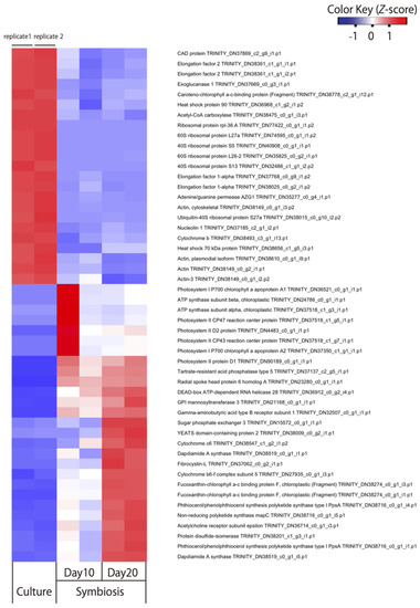 Heat map of RNA-seq analysis for 50 selected genes showing different gene expression pattern in free-living and symbiotic Durusdinium at 10 and 20 days post-inoculation (n = 2). Among the 1214 DEGs shown in Figure S1, the 50 genes with the lowest false discovery rate are summarized in the heatmap.