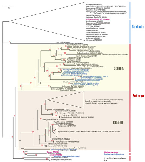 Maximum likelihood phylogenetic tree describing the relationships among dapdiamide A synthase proteins from representative eukaryotes and prokaryotes. All bacterial and one archaean sequence were separated from the remaining eukaryotic/archaeal sequences (78%). Most of the eukaryotic sequences formed two separate clades, A and B. In clade A, bacillariophyte sequences were monophyletic (99%), excluding haptophyte and Symbiodiniaceae sequences. Nine Symbiodinium sequences were monophyletic, with 86% support, and its sister group was shared by Emiliania huxleyi (haptophyte) sequences. Numbers in red near the nodes are ultrafast bootstrap support values; values < 50% are not included. Blue indicates genes derived from Symbiodiniaceae.
