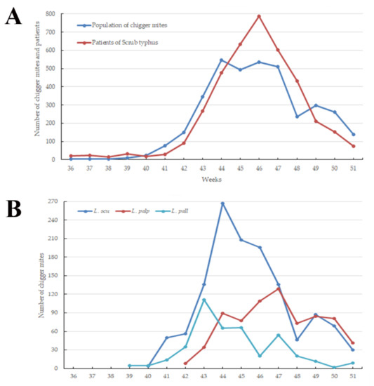 - Kim, S.Y.; Gill, B.; Song, B.G.; Chu, H.; Park, W.I.; Lee, H.I.; Shin, E.H.; Cho, S.H.; Roh, J.Y. Annual fluctuation in chigger mite populations and Orientia Tsutsugamushi Infections in scrub typhus endemic regions of South Korea. Osong Public Health Res. Perspect. 2019, 10, 351–358. [Google Scholar] [CrossRef]