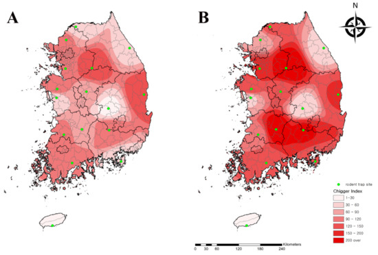 - Roh, J.Y.; Song, B.G.; Park, W.I.; Shin, E.H.; Park, C.; Park, M.Y.; Chang, K.S.; Lee, W.G.; Lee, H.I.; Shin, E.H. Coincidence between geographical distribution of Leptotrombidium scutellare and scrub typhus incidence in South Korea. PLoS ONE 2014, 9, e113193. [Google Scholar]