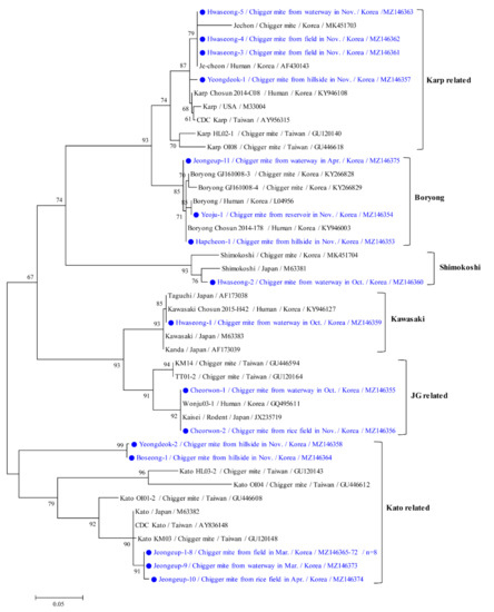 - Choi, Y.J.; Lee, I.Y.; Song, H.J.; Kim, J.; Park, H.J.; Song, D.; Jang, W.J. Geographical distribution of Orientia tsutsugamushi strains in chiggers from three provinces in Korea. Microbiol. Immunol. 2018, 62, 547–553. [Google Scholar] [CrossRef] [PubMed]