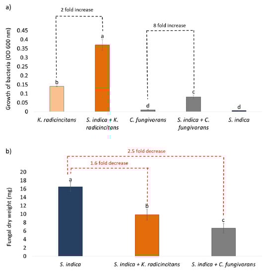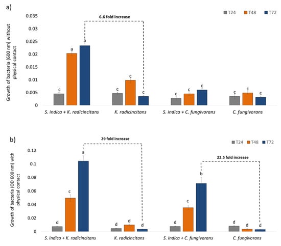 (a) Growth of C. fungivorans and K. radicincitans when co-cultivated without physical contact with S. indica. (b) Growth of C. fungivorans and K. radicincitans when co-cultivated with physical contact with S. indica. Different letters above bars represent significant differences (p < 0.05) according to three-way ANOVA with bacteria (C. fungivorans or K. radicincitans), fungus (with S. indica or without S. indica), and time (2 h and 72 h) as factors followed by a Tukey’s additive test. Error bars indicate the standard deviation of means of six different replicates.