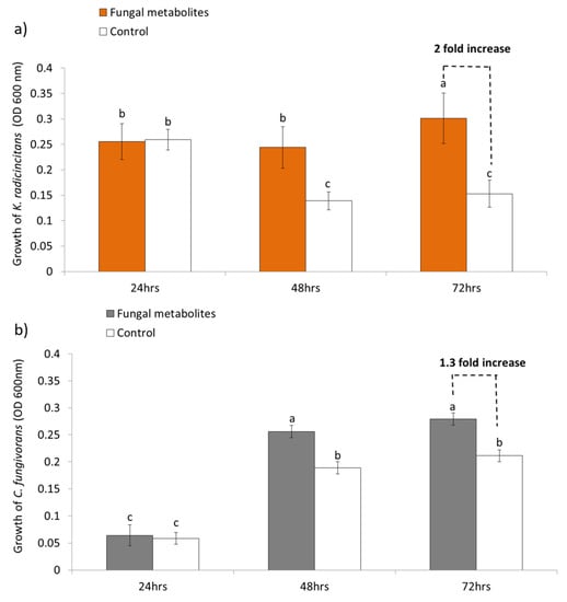In order to test the hypothesis of different feeding strategies by C. fungivorans and K. radicincitans, we evaluated the growth of both bacteria in minimal (M9) medium supplemented with S. indica metabolites as the only source of carbon. The control treatment consisted of metabolites extracted from the media without fungus. During 48 to 72 h of cultivation, both bacteria showed a significant increase in biomass in the media amended with fungal metabolites compared to the control treatment (Figure 3a,b). However, the growth of K. radicincitans increased by 2-fold, whereas the growth of C. fungivorans increased by only 1.3-fold. This suggests that while both bacteria could utilize the fungal metabolites for their growth, K. radicincitans was more efficient in feeding on fungal metabolites compared to C. fungivorans (Figure 3a).
