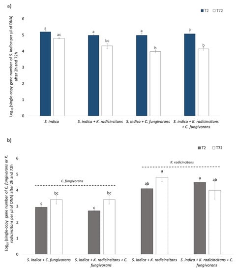 (a) Average log10 transformed single-copy gene numbers of S. indica (per µL of DNA) when co-cultivated with K. radicincitans, C. fungivorans, or both, 2 h and 72 h post inoculation. (b) Average log10 transformed single-copy gene numbers of C. fungivorans and K. radicincitans (per µL of DNA) when co-cultivated with S. indica, 2 h and 72 h post inoculation. Different letters above bars represent significant differences (p < 0.05) according to two-way ANOVA, using treatment and time as factors followed by a Tukey’s range test. Error bars indicate standard deviation of means of six different replicates.