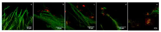 Imaging of microcolonies of S. indica co-cultured with C. fungivorans for 72 h at 24 °C. The colonization of the fungal hyphae by C. fungivorans was observed microscopically. (a) S. indica hyphae without bacteria (control). (b) C. fungivorans attached to the hyphal tips and forming bacterial aggregates 4 h post inoculation. (c) Lysis of hyphal tips was observed after 24 h. (d,e) After 72 h, broken hyphae of S. indica were observed. The GFP-and RFP-expressing strains of S. indica and C. fungivorans were used and images were taken using a confocal microscope at 40× magnification.