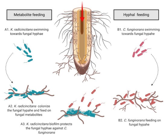 A conceptual model of hyphal protection and bacterial feeding strategies employed by K. radicincitans and C. fungivorans. Photosynthetically fixed carbon enters the rhizosphere via roots and fungal hyphae. Metabolite feeding: K. radicincitans colonizes the fungal hyphae and forms a thick biofilm while feeding on fungal metabolites. The biofilm confers protection to the fungal hyphae against C. fungivorans on solid agar medium (A1–A3). Hyphal feeding: the fungus-feeding bacterium, C. fungivorans, colonizes and feeds on the fungal hyphae via mycophagy (B1–B2).