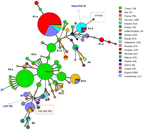 Minimum-spanning tree of B. anthracis multiple-locus variable-number tandem repeat analysis (MLVA) genotypes, constructed in BioNumerics using a categorical coefficient for clustering. The strains are marked with different colors according to the country of origin (see the legend); they originate from Slovenia (this study) or publicly available MLVA database (https://microbesgenotyping.i2bc.paris-saclay.fr/databases/view/9). The branches reflect the relationships between the strains (the thicker the line, the closer the genotypes). Slovenian strains are in the rectangles. The strain 102 from Luxembourg is marked as being the closest to the Slovenian strains 1/A, 5/A, and 6/C, and the genotypes 16–18 defined by Keim et al. [8] as one of the genotypes closest to the Slovenian strain 271/15. A and B labels refer to the genotype groups and subgroups defined by Keim et al. [8] to enable comparison; strains 1/A, 5/A, and 6/C belong to the genotype B.