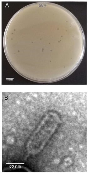 - Jurczak-Kurek, A.; Gąsior, T.; Nejman-Faleńczyk, B.; Bloch, S.; Dydecka, A.; Topka, G.; Necel, A.; Jakubowska-Deredas, M.; Narajczyk, M.; Richert, M.; et al. Biodiversity of bacteriophages: Morphological and biological properties of a large group of phages isolated from urban sewage. Sci. Rep. 2016, 6, 34338. [Google Scholar] [CrossRef]