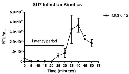 SU7 forms transparent, circular plaques approximately 1 mm in diameter (1.4 ± 0.3 mm) upon a lawn of its host bacteria ETEC7 (Figure 1A). TEM confirms that SU7 is a phage belonging to the rare C3 morphotype of the Podoviridae family within the Caudovirales order. It has an elongated head, with a length of 134 nm (134 ± 6 nm) and width of 44 nm (44 ± 2 nm), and a very short non-contractile tail, which could not be measured (Figure 1B). Occurring in less than 1% of Podoviridae virions, this rare morphotype has been observed among phages belonging to the Kuravirus genus (previously referred to as PhiEco32viruses) and include the E. coli phages vB_EcoP_SU10, Paul, and phiEco32 [47,48,49,50]. At an MOI of 0.12, SU7 has a latency period of 30 min (defined as the time from the addition of phages to a significant rise in phage concentration) and a burst size of 12 PFU/cell (Figure 2 and Supplementary Figure S1). The adsorption rate constant five minutes post infection was determined to be 8.78 × 10−9 mL/min. C3 phages with larger elongated heads theoretically would have smaller plaque morphology (presumably due to the fact that larger virions would diffuse more slowly through the OA compared to phages with smaller heads) as well as lower virulence and inferior infection kinetics [51,52]. Morphology-based and infection kinetic assumptions of SU7 alludes that, like other C3 phages, it would not be an ideal standalone candidate for phage therapy as it is not very virulent, has a long latency period, and poor adsorption [51,53,54].