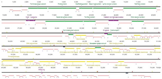 Genome analyses revealed SU7 has 22 transcripts initiated at hypothetical E. coli σ70 and phage promoters, eight putative rho-independent transcription terminator sites, 118 ORFs, and a putative tRNAArg gene. Many phages, including vB_EcoP_SU10, encode for this particular tRNA as way of compensating for low levels of host tRNA and to boost their translation [62]. Putative function was assigned to 30% of the predicted ORFs, which were categorized as either proteins pertaining to DNA metabolism, lysis, or structure (Figure 3 and Supplementary Table S1), whereas 70% matched hypothetical proteins or protein domains with no significant similarity. On average, Kuravirus phages with the C3 morphotype tend to have a double-stranded DNA genome with a size of 76,213 bp, which encodes for approximately 122 genes, and have a GC content of 42% (Table 1) [63]. The genome of SU7 did not contain a gene encoding phage RNA polymerase (RNAP), suggesting that the transcription of the phage genome is carried out by the host bacteria machinery only. The presence of phage-specific promoters found by the PhagePromoter program, on the other hand, suggests that the RNAP is modified to accept and utilize these phage promoters instead. In the case a phage RNAP cannot be found, an alternative sigma factor must be encoded by the phage [64]. It is possible that this alternative sigma factor can be found within the genome’s 70%, presenting as a hypothetical protein; however, functional studies are required to make this conclusion. Like other phages presenting the C3 morphotype, there is a lack of correlation between the size of SU7’s genome and head length, as determined by TEM, which suggests that the length of SU7’s DNA does not affect the elongation of it head [49].