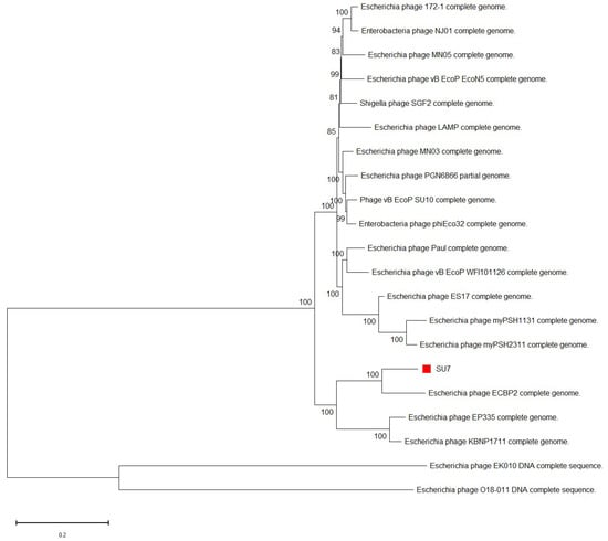 Phylogenetic analyses of the SU7 genome were conducted using complete nucleotide sequence alignments. Sequences for whole genomes were obtained from the NCBI genome databases (Table 1). The genome nucleotide sequence of SU7 was aligned against genomes showing E-values = 0 in discontinuous MegaBLAST searches against the nucleotide collection databases restricted to Caudovirales phages. Alignments were made in ClustalW with the default setting within the Mega-X software and in MAUVE version 20150226 with default settings [44,45,46]. An unrooted neighbor-joining phylogenetic tree was constructed using Mega-X with default settings. No outgroup was used for tree construction. Node confidence was evaluated using bootstrap testing based on 500 random re-samplings.