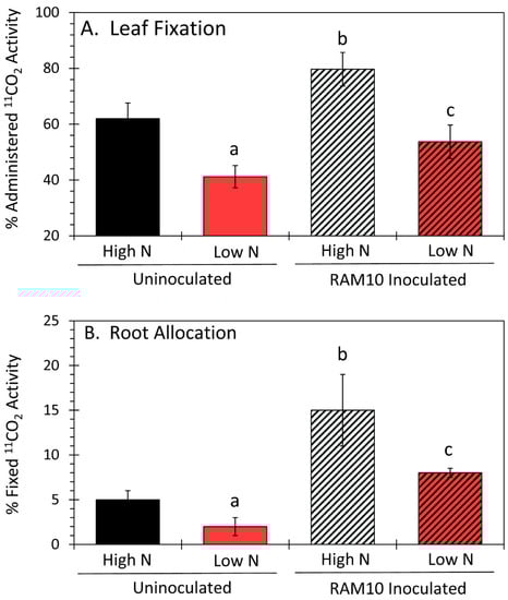 Levels of 11CO2 fixation are shown in (A) as a relative percentage of the administered 11CO2 pulse. All data were normalized to a standard fresh mass of leaf tissue. Levels of root allocation of 11C-photosynthates are presented in (B) as the percentage of the radioactivity fixed by the plant. Data reflect N = 6 plant replicates ± SE. Levels of significance (p < 0.05) were denoted by lowercase letters, where the letter “a” shows significance in data comparing uninoculated plants grown under low N to uninoculated plants grown under high N, the letter “b” shows significance in data comparing RAM10 inoculated plants grown under high N to uninoculated plants grown under the same conditions, and the letter “c” shows significance in data comparing RAM10 inoculated plants grown under low N to uninoculated plants grown under the same conditions.