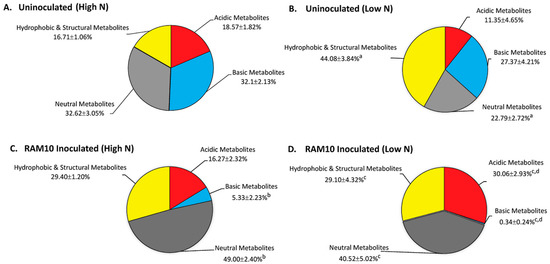 Carbon-11 aids in mapping changes in maize carbon metabolism as a function of N levels during plant growth and as a function of inoculation with RAM10 bacteria. The pie charts reflect the partitioning of “new” carbon (as 11C) into different metabolite pools of the load leaf tissue when harvested 20 min after the initial 11CO2 pulse. Data (mean ± SE) reflects N = 6–9 plant replicates. Pie sections notated with an “a” reflect statistical significance (p < 0.05) in a comparison between the uninoculated plants grown under low-N (B) and uninoculated plants grown under high-N (A) conditions. Pie sections denoted with a letter “b” reflect statistical significance (p < 0.05) in a comparison between RAM10-inoculated plants grown under high-N (C) and uninoculated plants grown under the same high-N conditions. Pie sections denoted with a letter “c” reflect statistical significance (p < 0.05) in a comparison between RAM10-inoculated plants grown under low-N (D) and uninoculated plants grown under the same low-N conditions. Pie sections denoted with a letter “d” reflect statistical significance (p < 0.05) in a comparison between RAM10-inoculated plants grown under low-N (D) conditions and inoculated plants grown under high-N conditions.