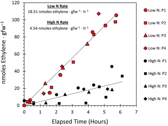 Results from acetyene reduction assays are shown in this figure for excised maize roots colonized by RAM10 H. seropedicae. The amount of ethylene produced (as nmole ethylene gfw−1 of root tissue in the sample) represents a measure of nitrogenase activity. Each root sample was analyzed repeatedly over the time course of 6 h from introduction of acetylene gas to the sample. Four biological replicates (labeled P1–P4) were performed for inoculated plants grown under low N (1 mM nitrate) and inoculated plants grown under high N (10 mM nitrate). Linear regression analysis was applied to arrive at the trendlines shown in the plot where slopes of these trendlines were calculated for the different N growth regimes, providing rates for nitrogenase activity in reducing acetylene-to-ethylene.