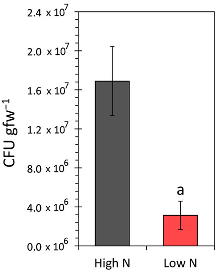 Results from microbial growth performance on live maize roots as determined by tissue drop plate assays are presented in this figure for growth regimes, including low N (1 mM nitrate) and high N (10 mM nitrate). Microbial content is presented as colony-forming units per gram of fresh root tissue (CFU gfw−1) subjected to the analysis. Data bars reflect means ± SE for N = 8 biological replicates under the high-N growth conditions and N = 7 replicates under the low-N conditions. Statistical significance (p < 0.05) is depicted by the letter “a”.