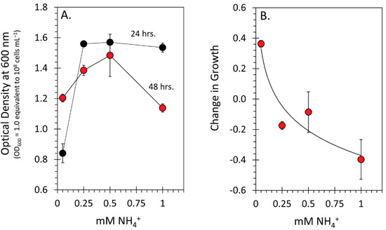 Results from microbial growth performance, as determined by the optical density measured at 600 nm, are presented in this figure for liquid cultures possessing different levels of extraneous ammonium chloride. Determinations of microbial growth were taken at 24 h and 48 h (A). The change in growth performance presented in (B) reflects the difference in optical densities between 48 h and 24 h values. Data in both panels reflect mean values ± SE for N = 3 biological replicates.
