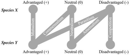 Species in a community may interact with each other in various ways, forming a biocoenosis. The interactions can be interspecies or intraspecies, having a strong influence on the evolution of the species, and often the partners coevolve []. Traditionally, these interactions have been classified and termed as follows (Figure 1): Neutralism (0/0), mutualism (+/+), Competition (-/-), Commensalism (+/0), Amensalism (-/0), parasitism (+/-) and Predation (+/-) [,]. These interactions, both as inter- and intraspecies exchanges, change with both time and location and are dynamic based on the prevailing conditions being either beneficial, inhibitory or commensal [,].