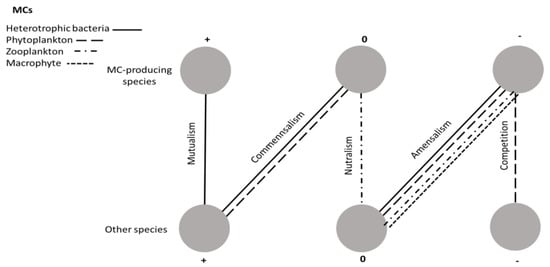 The interspecies interactions between MC producers and the other aquatic community members are difficult to characterize in general terms (Figure 2) as mutualism is observed in terms of nutrient cycling and competition for nutrients. In general, MC seems to have inhibitory effects on the biodiversity and abundance of aquatic organisms (amensalism), which could be interpreted as lending a competitive advantage to the producer. To further complicate understanding the complexity of the interactions, many studies have been restricted to understanding the effects of one species on another and no information was gathered on the interaction in the opposite direction. Additionally, prolonged exposure to MC may raise localized adaptation to the hepatotoxin.