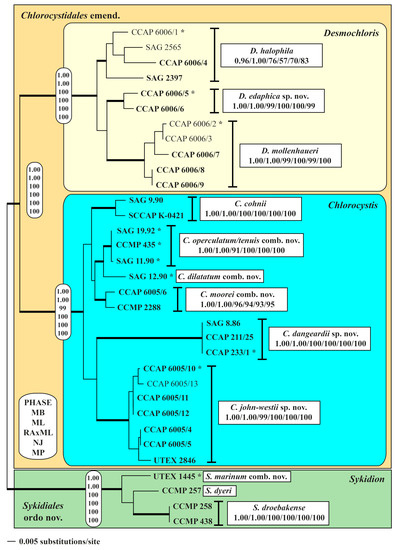 To obtain a better resolution among the investigated strains, we analyzed the concatenated data set of SSU and ITS. As demonstrated in Figure 2, the three genera Desmochloris, Chlorocystis, and Sykidion were highly supported in all Bayesian and bootstrap analyses. Within Desmochloris, three clades could be revealed. Six and three lineages were discovered in Chlorocystis and Sykidion, respectively. All subdivisions in these genera are highly supported in all phylogenetic analyses.
