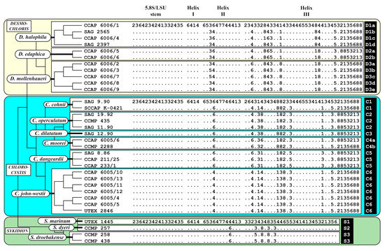 As demonstrated in Figure 2, the genera were subdivided into lineages. This raises the question of if these lineages represent species. Therefore, we analyzed the ITS-2 secondary structures of all investigated strains and used the ITS-2/CBC approach introduced by Darienko & Pröschold [45] for comparison. The secondary structures presented in Figures S2–S4 were highly conserved among the strains. Among the three helices (I-III, IV is missing), only the loops of the helices I and II are variable (highlighted in white boxes). The base pairs of the conserved regions translated into number code showed 17 variable base pair positions in Desmochloris, 17 in Chlorocystis, and five in Sykidion (Figure 3). Each highly supported lineage in Figure 2 could be distinguished by a unique ITS-2 barcode, with few minor changes within species. The three lineages of Desmochloris and Sykidion are only separated by HCBCs, however, the phylogenetic analyses showed a high support of the separation into three species, respectively. In contrast, the six lineages of Chlorocystis are separated by CBCs and HCBCs. As a consequence, all lineages represent species of the Desmochloris, Chlorocystis, and Sykidion.