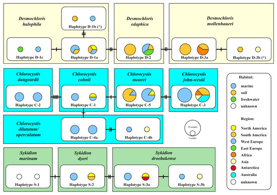 For an overview of the distribution of all species, the V4 and V9 regions of the SSU, commonly used in high-throughput sequence approaches, were proven to be, or not to be, diagnostic for species identification. The V4 region fulfilled this criterion and was used in a BLASTn search in GenBank. In addition, the ITS-2 was also checked, however, no additional entry was found in the BLASTn search. Therefore, we applied the usage of the V4 for finding entries in GenBank. Using this approach (100% coverage, >97% identity), only six additional entries of Desmochloris, nine of Chlorocystis, and two of Sykidion were found (Table S1). The metadata (geographical origin and habitat) belonging to these entries were included with those of the exiting data for our investigated strains to create a dataset for the TCS analyses. As demonstrated in Figure 4, all species could be clearly identified by the V4. Only the authentic strains of Chlorocystis dilatatum (SAG 11.90), C. tenuis (SAG 19.92), and C. operculatum (SAG 11.90) have identical V4 regions. Most species are represented by only one haplotype. For Desmochloris halophila, D. mollenhaueri, and Sykidion droebakense, few haplotypes could be discovered. All species so far known showed no habitat or geographical preference, with two exceptions: (i) the three species of Desmochloris occurred in terrestrial habitats, only haplotype D-1a was also found in a marine environment. (ii) The genera Chlorocystis and Sykidion were exclusively discovered in marine habitats. Interestingly, Chlorocystis moorei was also found in saline soils.