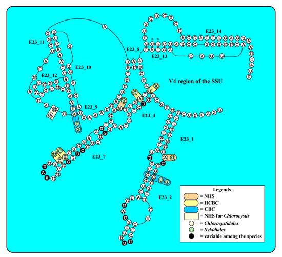 The V4 secondary structure revealed non-homoplasious synaphomorphies (NHSs) and compensatory base changes (HCBCs and CBCs) for the orders Chlorocystidales and Sykidiales, as well as Chlorocystis. Two CBCs, four HCBCs, and two NHSs were found to be characteristic for both orders. The genus Chlorocystis has one NHS in the spacer between E23_11 and E23_9.