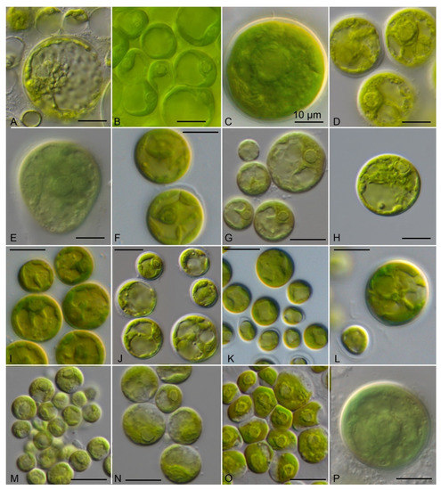 - Komárek, J.; Fott, B. Chlorophyceae (Grünalgen) Ordnung: Chlorococcales. In Das Phytoplankton des Süßwassers 7. Teil, 1. Hälfte; Huber-Pestalozzi, G., Ed.; Schweizerbart: Stuttgart, Germany, 1983; pp. 1–1044. [Google Scholar]