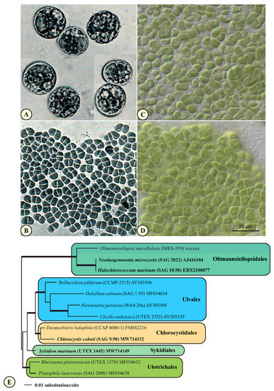 Our sequencing results confirm the proposal of Kornmann & Sahling [16] to exclude Chlorocystis and Halochlorococcum from the chlorophycean order Chlorococcales, and to transfer them to their newly described order Chlorocystidales (Codiolophyceae), based on studies of their life histories (presence of a “Codiolum”-stage). The taxonomic problem arises as follows. The type genus of Chlorocystidales and the type species of Chlorocystis present no problem. We could clearly identify C. cohnii in our study. The morphology of the strain SAG 9.90 corresponded with the described life cycle demonstrated by Kornmann & Sahling [16]. However, several problems occurred with the second genus, Halochlorococcum. No type material of the type species H. marinum is available in culture collection. The material of Kornmann & Sahling deposited at SAG under the number SAG 10.90 does not correspond to morphology either presented by the authors nor by Dangeard [65], but fitted in morphology to Neodangemannia microcystis (Figure 8A–D). The latter species was originally described as Ulvella microcystis by Dangeard [66], the morphology of this species is identical to those demonstrated in Figure 8B,D. Therefore, the transcriptome of SAG 10.90, published in Gulbrandsen et al. [64], represents Neodangemannia microcystis and not Halochlorococcum marinum, as demonstrated by comparison of the SSU rDNA sequences (see Figure 8E). All other species of Halochlorococcum described by Kornmann & Sahling [16] belong to Chlorocystis (see Taxonomic consequences below).