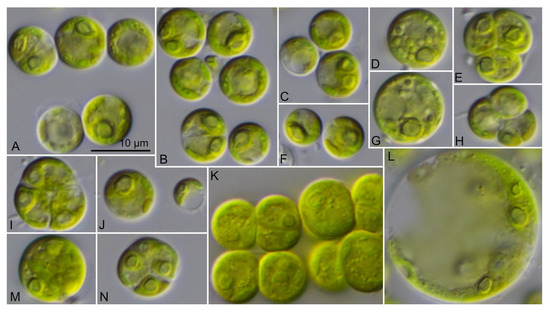 Morphology and phenotypic plasticity of CCAP 6006/5 Desmochloris edaphica sp. nov., scale bar = 10 μm for all pictures (A–N).