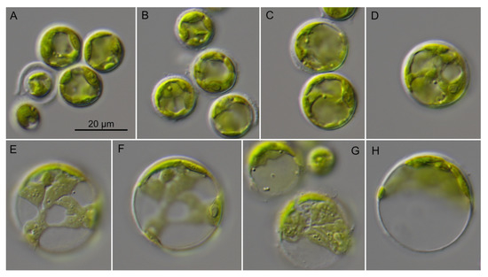 - Moore, G.T. New or little known unicellular algae. I. Chlorocystis Cohnii. Bot. Gaz. 1900, 30, 100–112. [Google Scholar] [CrossRef]