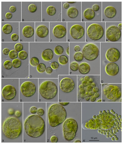 - Watanabe, S.; Himizu, A.; Lewis, L.A.; Floyd, G.L.; Fuerst, P.A. Pseudoneochloris marina (Chlorophyta), a new coccoid ulvophycean alga, and its phylogenetic position inferred from morphological and molecular data. J. Phycol. 2000, 36, 596–604. [Google Scholar] [CrossRef] [PubMed]