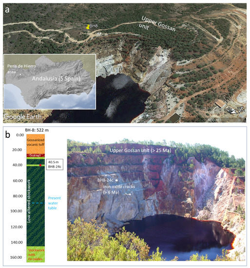 Composition of pictures and figures showing the geological features of the BH8 drilling site of Peña de Hierro. (a) Google Earth aerial image displaying the BH8 drilling location below the Upper Gossan (25 Ma) materials topping Peña de Hierro. (b) Geological section of the drilled geological units (gossanized volcanic tuff, gossan, stockwork with Fe oxides, and low altered stockwork) where sample BH8-24c was collected. The units can be partially recognized (b) at the material outcrops that are exposed in the pit lake of the abandoned mine, where different faults can be recognized affecting the gossan and the Carboniferous basement. The geological section and outcrop picture have been produced and owned by David Fernandez-Remolar.