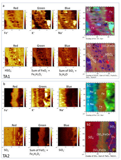 Characterization of the layer mineral composition through the distribution of inorganic cations (Fe+, Na+, and K+) and anions (SO4−, FeO2− + Fe2H5O2−, and SiO2− + Si2H4O−) through a red, green blue graph (RGB) merging different ion images. Inorganic composition in TA1 (a) and TA2 (b) showing five distinctive mineral areas like ferruginous and sulfatic-rich ((SO4)FeOx), silica-rich (SiO2), sulfur enriched (SO4−), and heterogeneous, which reflects a greater compositional variability of the microbrecciated layer. They follow the occurrence of the different layered units described in Figure 2b; where (1) ferruginous and sulfatic-rich composition meet the microlaminated layer (ma) and the matrix of the microbrecciated layer (mb), (2) the silica-rich area follows the fibrous and cryptocrystalline layer (fb), and (3) and the sulfate area depleted in Fe corresponds with the glassy layer (ms). Furthermore, the compositionally heterogeneous area with SiO2 and SO4− correspond with different microclasts that are embedded in the microbrecciated layer (mb). The cation distribution provides some additional information regarding the geochemical composition of the different units. It is observed an association between K+ and Na+ with the silica and sulfate-rich and iron-depleted areas. Indeed, K+ is highly associated with the crenulated unit (cr in Figure 2b) that is enriched in phosphate (Figure 4a,b). K+ and Na+ also enhance the internal microstructure (b2) of the glassy layer (ms) where they occur forming thin laminas and enlarged nodular-like appearance that meets the filamentous structures shown in Figure 2b. The ToF-SIMS images were obtained from a rasterized surface area of a 500 μm square.