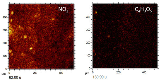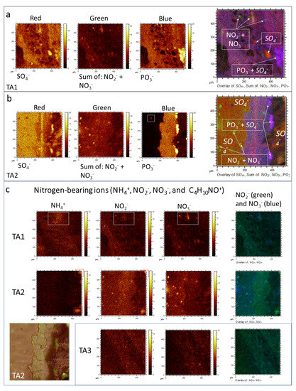 In addition, K+ also show a higher affinity with the S-bearing anion microstructures, while Na+ distribution is more akin to microstructures of Si-bearing anions (Figure 3a,b; Supplementary Figure S2). The NOn−(2≤n≤3) distribution (Figure 4c) appears as tinny (<10 microns) ovoidal micronodules scattered throughout the analyzed TAs with no clear association with other ions (Figure 4a–c). Instead, they show a dissimilar arrangement with the microstructures defined by the occurrence of the Si-bearing ions like SiO2−, and Si2H4O−. Although the appearance of NO2− and NO3− is very similar, it is slightly disparate in intensity and distribution (Figure 4c). Moreover, NO2− partly meet NH4+ in patches or large nodular structures (>50 microns), while NO3− is entirely dissimilar with the NH4+. Therefore, the distribution of NH4+ and NO2− is similar to the occurrence of some N-bearing organic cations (Figure 4c).