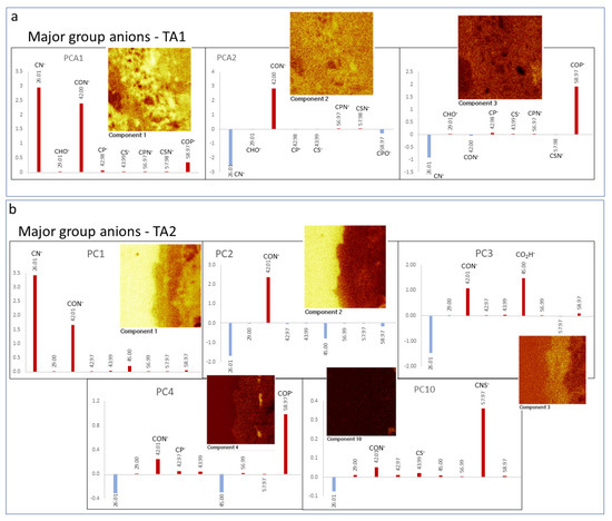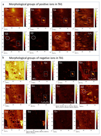 By combining molecular and secondary electron ToF-SIMS imaging, it has been possible to identify the following morphological groups based on the molecular distribution of positive and negative ions (Figure 5, Figure 6 and Figure 7; Supplementary Figure S2, Tables S1 and S2) in the three different TAs: