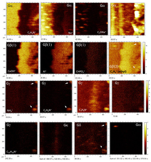 As it has been mentioned, the occurrence of positive and negative ions in TA1 and TA2 suggests the presence of protein fragments (e.g., C3H8N+, C5H12N+, and C8H10N+, see Siljeström et al. [40]) and amino acids like lysine, arginine, cysteine, glycine, or aspargarine [31,41,42]. The distribution of amino acid-derived ions that is alternating among microsites (e.g., Gα and Gβ versus Gγ) suggests the different microbial sources for peptides.