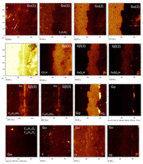 The pattern Gβ(2) is characterized by negative ions occurring in the microlaminated layer and delimiting a couple of nodular structures found in the fibrous layer (Figure 3b and Figure 7). The most intense negative fragments are 88.93, 168.88, and 250.84, which fit well with the Fe- and S-bearing negative ions like FeO2H−, FeSO5H−, and CH7Fe3O4−, respectively. Some m/z 24.00, 41.00, 50.02, 51.02, 189.00, 203.01, 387.21, 411.24, 421.22, 465.61, 473.28, 479.33, 481.32, and 735.44, also follow the pattern Gβ(2) at a lower intensity. They match negative ions like C2−, C2HO−, CH6S−/C4H2−, C4H3−, C6H5O7−, C7H7O7−, C23H31O5−/C26H27O3−, C23H39O6−/ C26H35O4−, C23H33O7−, C5Fe5O4P2−, C24H41O9−/C31H37O4−, C27H45O7−/C31H45O4−, C31H45O5−/C27H45O8−, and C51H59O4−/C44H63O9−/C47H59O7−.