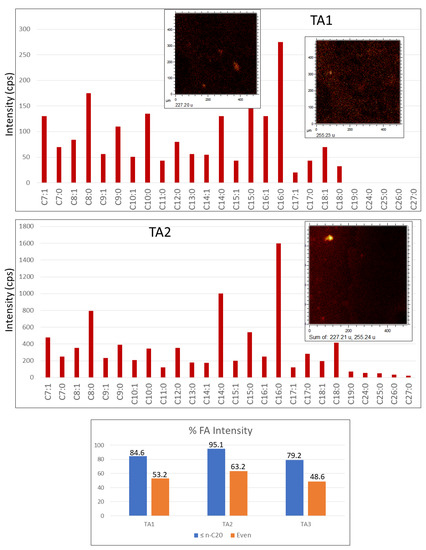 Bar diagrams plotting the mass distribution of saturated and monounsaturated fatty acids in TA1 and TA2. The lower diagram draws a high abundance for ≤n-C20, moderate for even FA chains supporting a microbial origin for the organic compounds. Diagram units are expressed as count per second (cps) intensity unit. The ToF-SIMS images were obtained from a rasterized surface area of a 500 μm square.