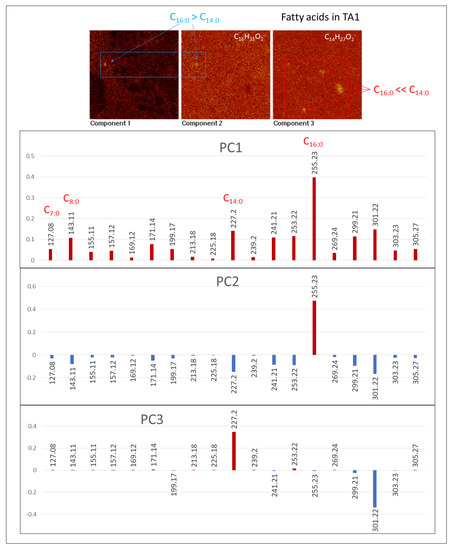 The spectral analysis recognizes a diverse set of [M-H]− and [M]− ions from 127.09 to 305.25 Da (Figure 8; Supplementary Figure S5; Supplementary Table S5) with maximum peaks at 227.20, and 255.23 corresponding to myristic (C14H28O2), and palmitic (C16H32O2) acids. Although the fatty acid distribution is similar in the three TA1, TA2, and TA3, the FAs intensity is one order of magnitude higher in TA2 suggesting a greater biomass preservation. The FAs distribution is widely spread throughout the whole surface associated to the Fe- and S-bearing ions (e.g., FeO2−, Fe2H5O2−, and FeSO5H−) except in some nodular microstructures where the mass intensity is maximal (Supplementary Figure S5a–c). In this case, they co-occur with other ions like NO3− and SO−n(2≤n≤4). In TA1, FAs show a high concentration in various elements (Supplementary Figure S5a) like spheroidal (m/z 127.08, 157.12, and 169.12), ovoidal and circular Gα microstructures (m/z 227.20), and Gα linear elements (m/z 143.11). The FAs distribution in TA2 (Figure 7; Supplementary Figure S5b) is nearly restricted to a nodular structure that characterizes Gω, meanwhile they also show a secondary intensity in the glassy layer in which the Gα pattern concurs. Furthermore, TA3 FAs show two distinctive distribution patterns corresponding with the massive occurrence in the Fe- and S-bearing ion layers (Supplementary Figure S5c) including most of the [M − H]− peaks. With their spheric microstructures (m/z 143.11, and 157.12), they are also defined by maximum concentration in PO−n(2≤n≤5) ions. The FAs occurrence in TA2 and TA3 correlates well with the distribution of ions, which is tentatively assigned to diacylglycerides and glycerophospholipids.