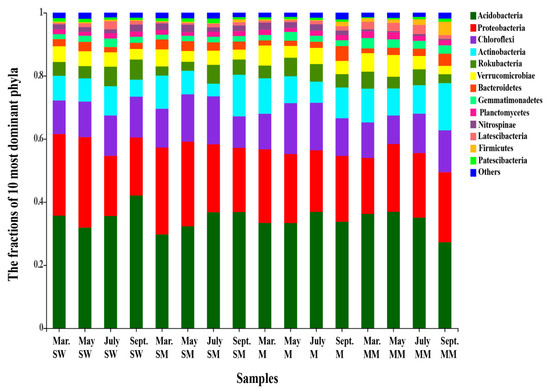 The fractions of the 10 most dominant phyla from different samples. The colors of the bars represent the bacterial phyla, and the length represents the relative abundance of the bacterial phyla in the corresponding sample. SW is swamp wetland, SM is swamp meadow, M is meadow, MM is mature meadow.