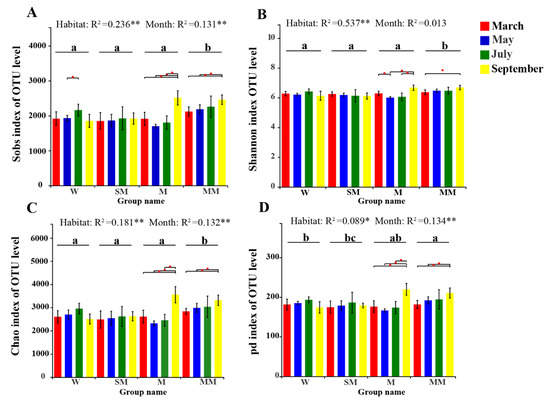 Estimated values of bacterial community Sobs index (A), Shannon index (B), Chao 1 index (C) and phylogenetic diversity (D). Significant differences are indicated by different letters. Significant differences among months in each habitat are marked by stars (** p < 0.01; * p < 0.05). The letters of “a”, “b” and “c” in the figure represent the post-hoc results following ANOVA analyses. Significant differences between different habitats are marked by different letters. SW is swamp wetland, SM is swamp meadow, M is meadow, MM is mature meadow.
