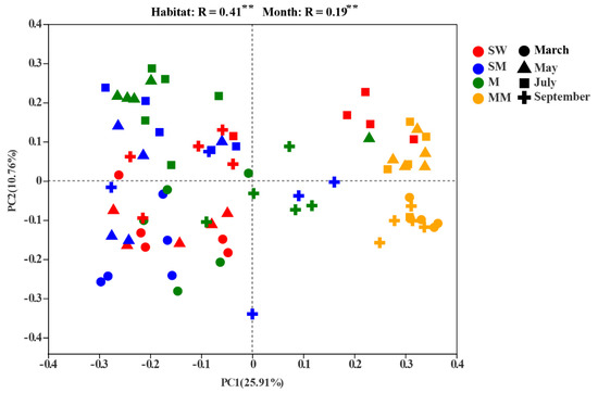 Principal-coordinate analysis (PCoA) plots of bacterial communities in all soil samples. The significant effect of month and habitat on microbial beta diversity was detected by PerMANOVA test. ** p < 0.01. SW is swamp wetland, SM is swamp meadow, M is meadow, MM is mature meadow.