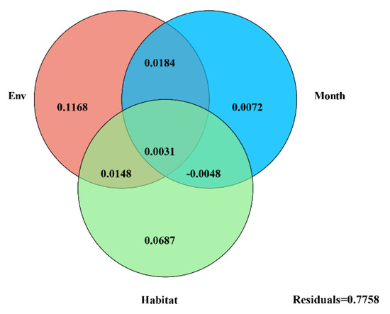 Variation partitioning analysis performed to quantify the contribution of environmental variables, sampling month and habitat to bacterial community variations.