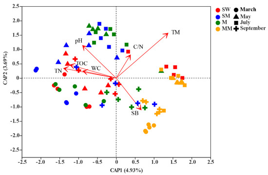 Distance-based redundancy analysis (db-RDA) of bacterial communities in all soil samples. The values of axes 1 and 2 are the percentages explained by the corresponding axis. TN is soil total nitrogen, WC is soil water content, SB is shoot biomass, TOC is soil total organic carbon, TM is soil temperature. SW is swamp wetland, SM is swamp meadow, M is meadow, MM is mature meadow.