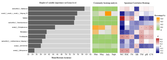 Top 10 identity biomarkers used for discriminating bacterial communities in different seasons (detected by random forest model). The assigned taxonomy of each taxon is displayed at the genus level. The bar plots on the left show the importance value of each biomarker estimated by the random forest model; the middle heatmap plots show the relative percentage of those biomarkers in different seasons; the right heatmaps show the Spearman correlations between the relative abundances of identity biomarkers and environmental variables. WC, soil water content; TOC, total organic carbon; TN, total nitrogen; SB, shoot biomass; TM, soil temperature; *** p < 0.001; ** p < 0.01; * p < 0.05.