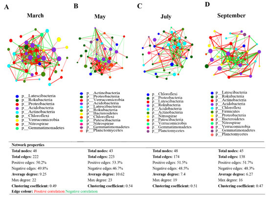 Co-occurrence networks and topological properties of bacteria from March (A), May (B), July (C) and September (D) soils. Nodes are colored according to microbial phylum, and the nodes with a larger size show the potential keystone genera (correlation coefficient ≥ 0.6, p < 0.01). Circle and square node shapes represent bacterial genus, respectively. Edges indicate correlations among nodes; the red and blue edges represent positive and negative correlations, respectively.